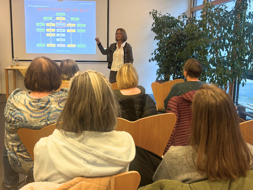 Ein Thema wie "Erbrecht" wirkt auf den ersten Blick oft komplex und trocken. Doch Frau Mundanjohl gelang es erneut, die Inhalte anschaulich, praxisnah und verständlich zu vermitteln. Nach einer kurzen Einführung in die Grundlagen des Erbrechts lag der Fokus des Abends auf einem besonders wichtigen Aspekt: dem sog. Behindertentestament. Gerade für Angehörige von Menschen mit Behinderung ist dieses Thema von großer Bedeutung – und wirft viele individuelle Fragen auf.