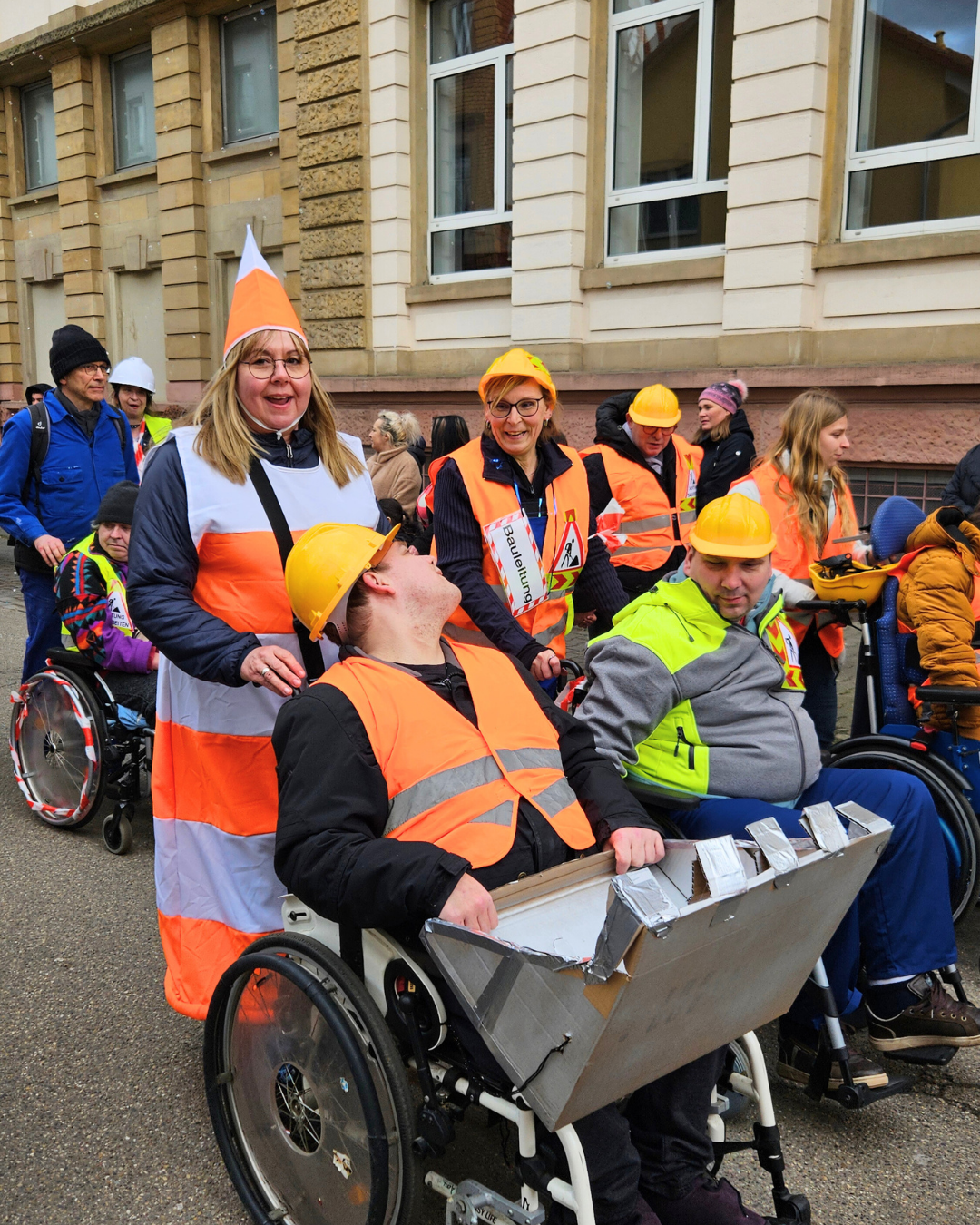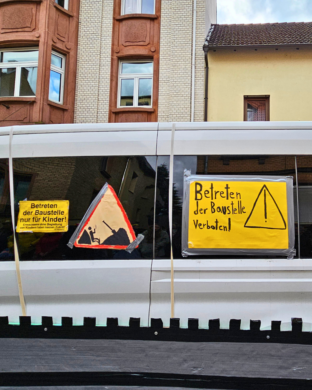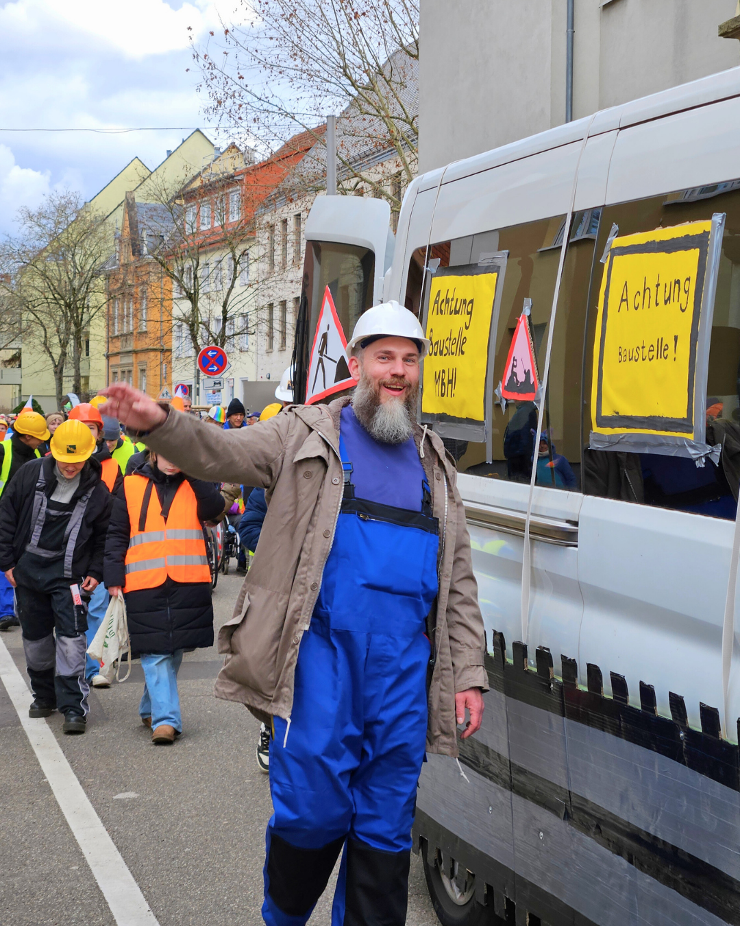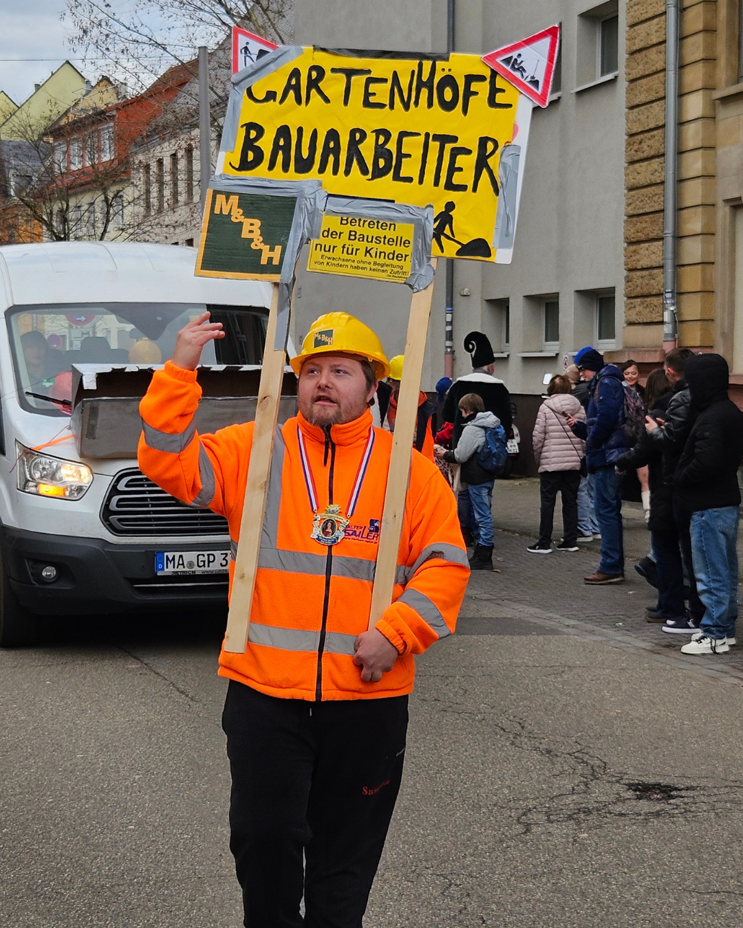 Diesmal führte unsere Bauarbeitertruppe das Neckarauer Zügl sogar an und sorgte von Beginn an für beste Stimmung. Doch kurz vor dem Start gab es noch einen echten Schreckmoment: Der als Bagger dekorierte Sprinter sprang nicht an! Trotz vereinter Kräfte ließ sich das tonnenschwere Gefährt nicht anschieben. Kurzerhand musste der Transporter aus der „Luise“ umdekoriert und sogar noch neu angemeldet werden. Ordnung muss schließlich sein! Hier zeigte sich aber mal wieder, wie flexibel, spontan und lösungsorientiert wir als Team sind – gemeinsam haben wir das Problem gelöst und uns die gute Laune nicht nehmen lassen!