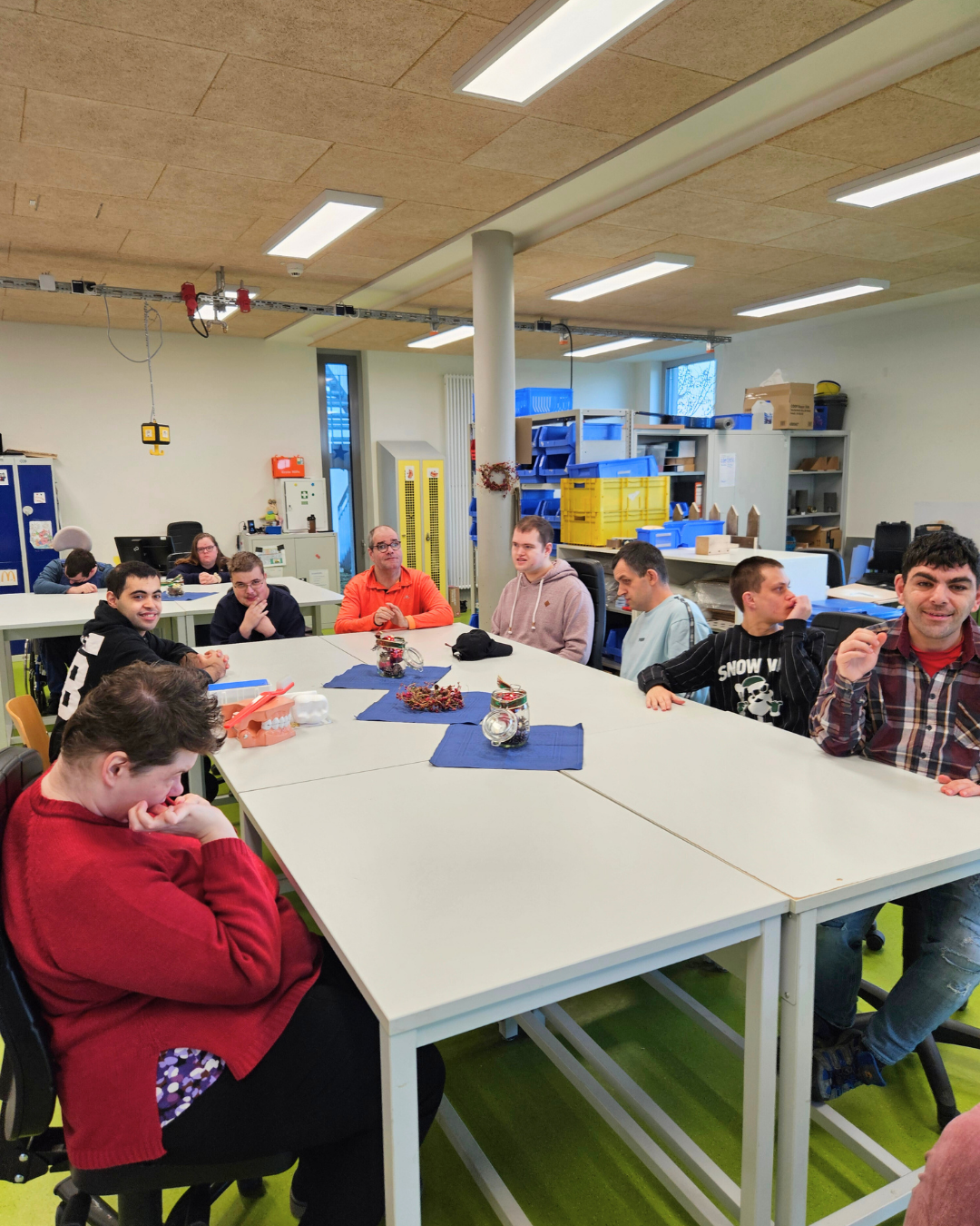 Im FuB der Werkstatt Weinheim ging es kürzlich dem Zucker und seinen Folgen ordentlich an den Kragen. Prophylaxe-Fachfrau Manuela Spanier von der Arbeitsgemeinschaft Zahngesundheit Heidelberg und Rhein-Neckar-Kreis war mit „schwerem Gerät“ in die Etzwiesenstraße gekommen – und sorgte für viele Aha-Momente rund um das Thema Zahngesundheit.
