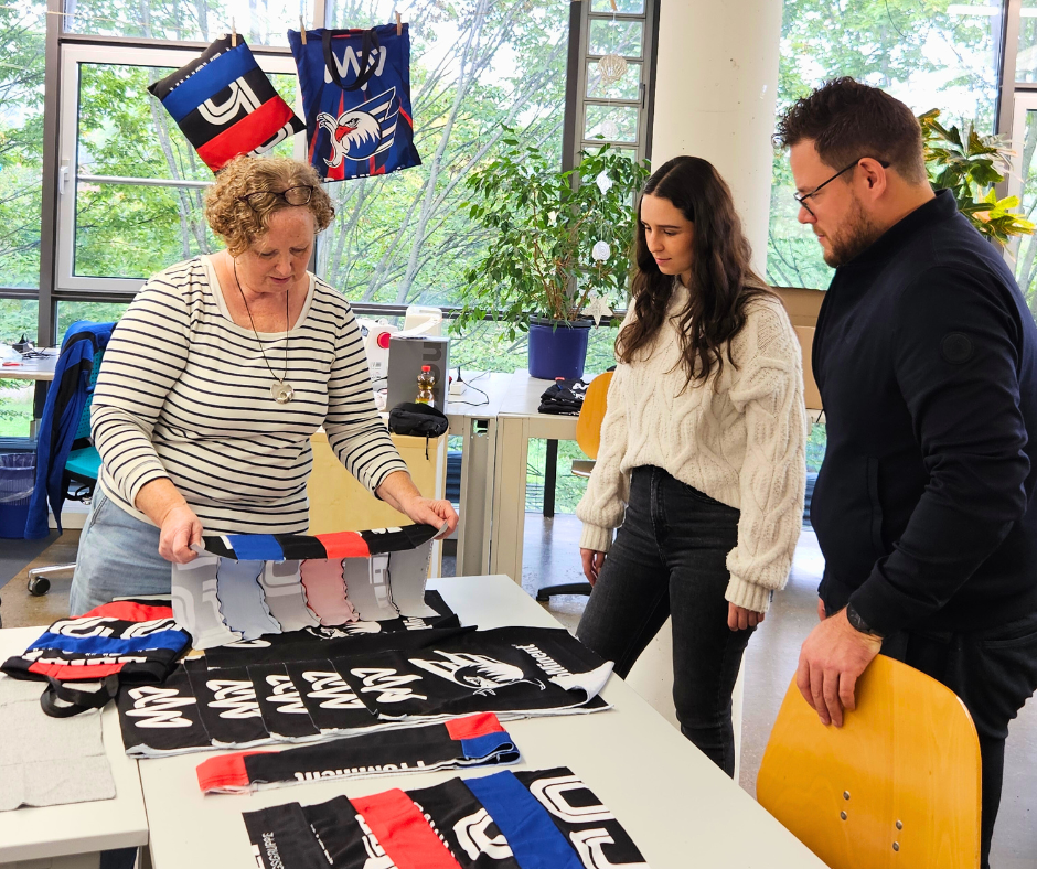 Davon konnten sich kürzlich Alexander Skasik (Presse) und Katharina Ecker (Social Media Managerin) der Adler Mannheim persönlich überzeugen. Bei ihrem Besuch in der Kreativwerkstatt war die Begeisterung der beiden spürbar – nicht nur für die Produkte, sondern auch für die Menschen, die dahinterstehen. „Es ist beeindruckend zu sehen, mit welcher Freude und Präzision hier gearbeitet wird“, so der Tenor der Gäste. Die Wertschätzung war gegenseitig: Für die Klient*innen bedeuten solche Kooperationen echte Anerkennung und die Chance, ihr Können zu zeigen. Eben einfach eine tolle nachhaltige undsoziale Zusammenarbeit, von der alle profitieren: Die Adler-Trikots verschwinden nicht im Müll, sondern es entstehen handgemachte Unikate – und gleichzeitig rückt die Arbeit der Menschen in der Gemeindediakonie in den Fokus.